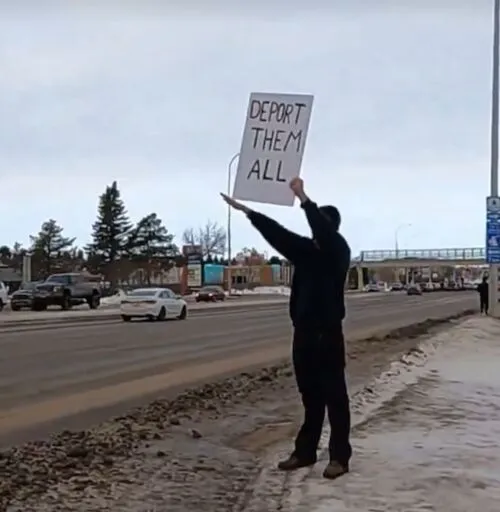 A bunch of losers went out and threw Nazi salutes in Alberta, Canada yesterday while holding racist signs.
