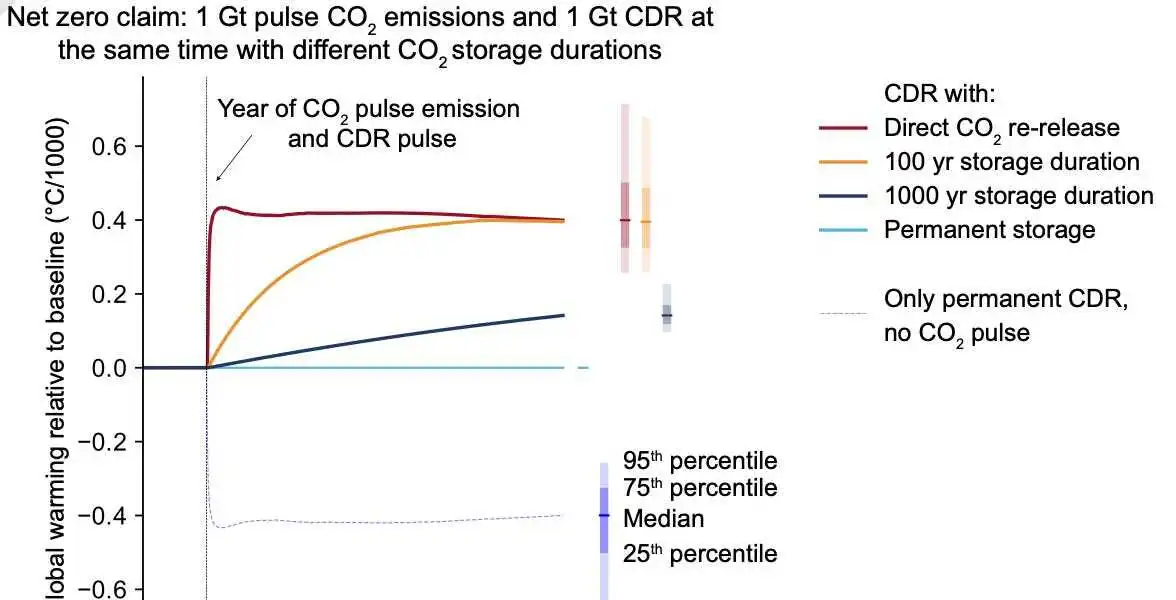 Durability of carbon dioxide removal is critical for stabilizing temperatures: Letting countries or companies neutralize fossil fuel emissions with temporary carbon removal breaks the math of net zero
