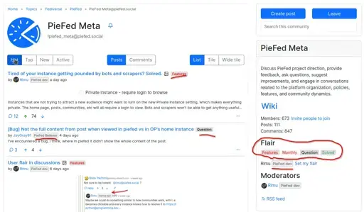 On the surface flair on PieFed functions very similar to how it does on Reddit – on posts they’re community-specific tags that can be used to filter posts in a community. People can also add flair to themselves which is just a piece of text that appears next to their name whenever they make posts or comments in the community. This can be helpful for giving a hint about someone’s background, interests or expertise.