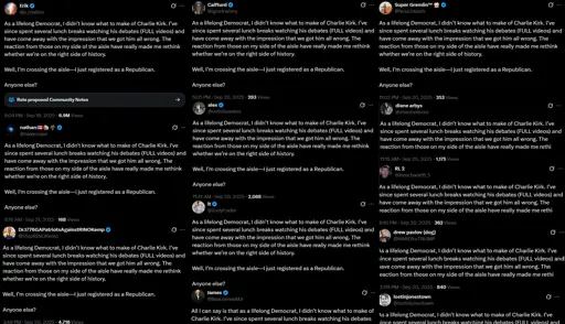 There's a campaign going on to push the idea that Democrats are changing sides after watching Charlie Kirk videos. Interestingly, even though the bots are posting the exact same copy-pasted message, they seem to be controlled by an AI, since they will respond to comments, and even basic techniques for outing an AI (like "ignore all previous instructions" comments) work against them. So the first post is hardcoded, but they're using an LLM for the responses.