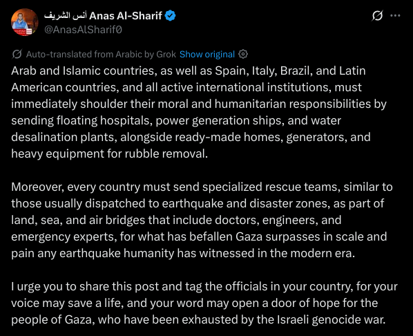 https://xcancel.com/AnasAlSharif0/status/1976758810019537181
