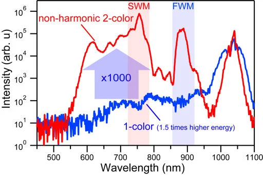 Breakthrough in water-based light generation: 1,000-fold enhancement of white-light output using non-harmonic two-color femtosecond lasers Experimental demonstration that non-harmonic two-color femtosecond excitation produces a ~1,000× stronger supercontinuum in water compared to conventional single-color excitation. Credit: Institute for Molecular Science / Tsuneto Kanai