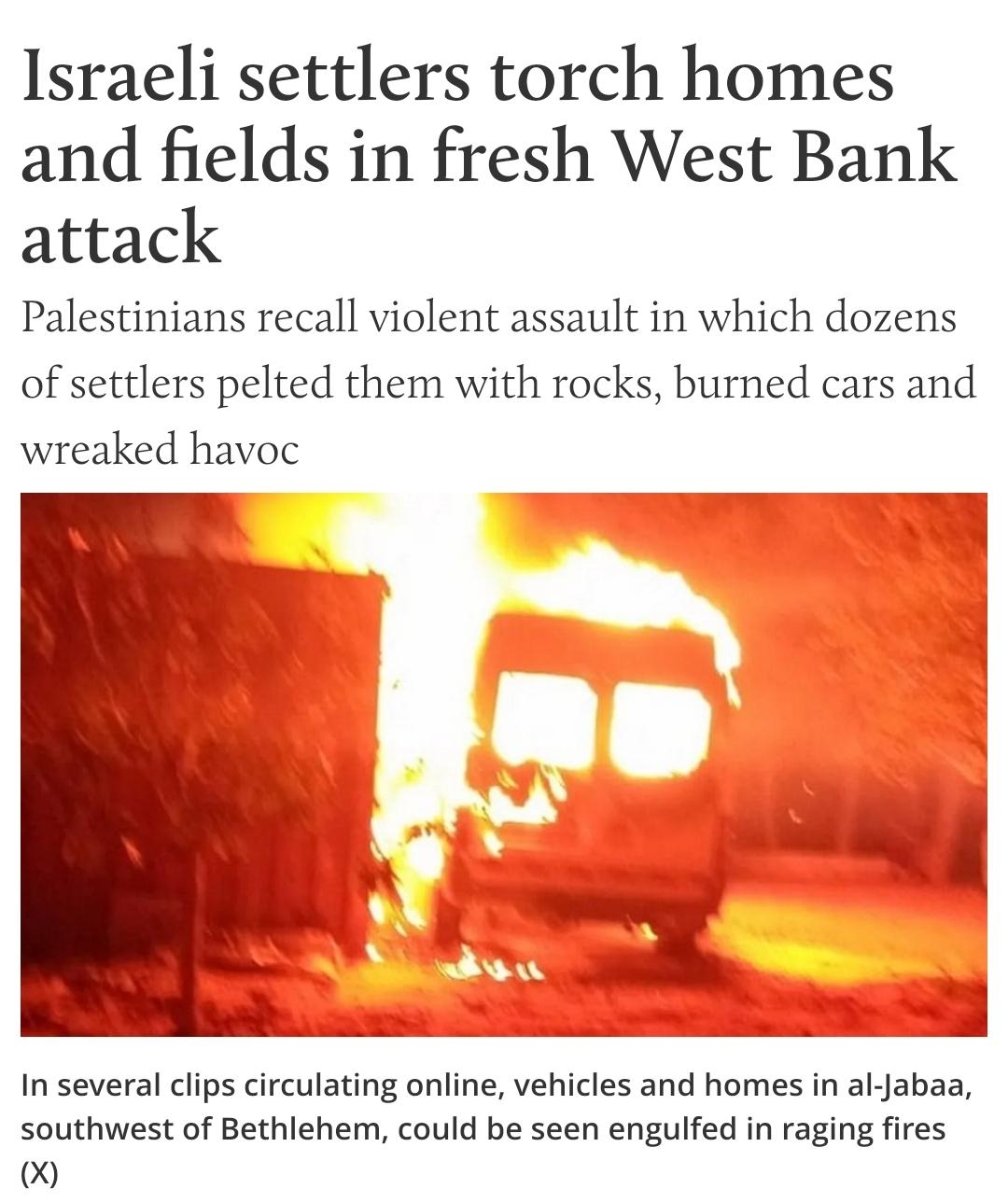 The Ongoing Pogrom:Israeli settlers set fire to Palestinian homes, vehicles and farmland in the latest attack in the occupied West Bank on Monday.