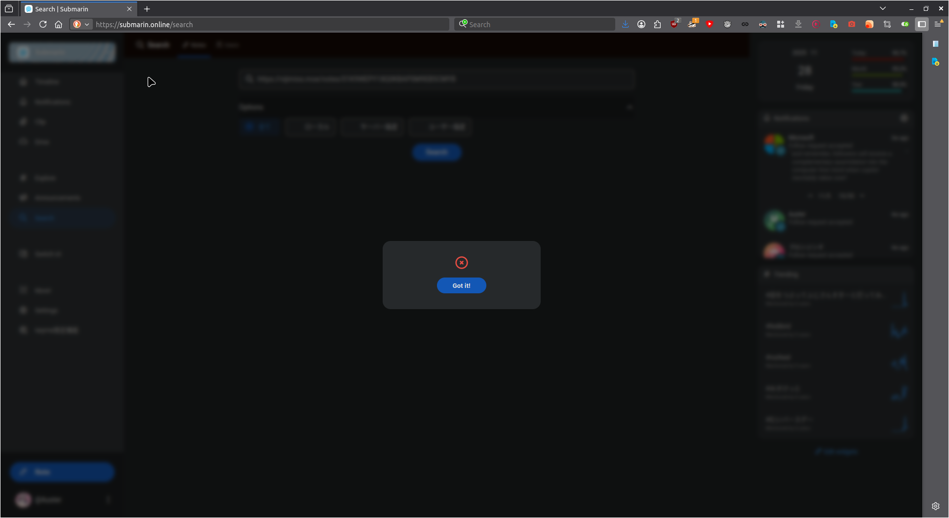 I was looking for a post through the link from another instance and saw this error. The exit button ("Got it!") sounds like the search went through, given the lack of information in the error.