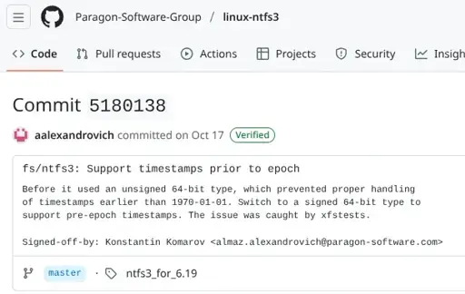 While likely to not see too much use in practice, the NTFS3 driver with Linux 6.19 can now support timestamps prior to the year 1970. The first change noted for NTFS3 in the new kernel is pre-Epoch timestamps support for handling dates prior to the start of Unix time on 1 January 1970. NTFS3 had been relying on an unsigned 64-bit type but has now switched to a signed 64-bit type for coping with pre-epoch timestamps. The issue was raised by the xfstests program testing the file-system. But for anyone that may happen to have pre-1970 timestamps, Linux 6.19 fixes things up for NTFS3.