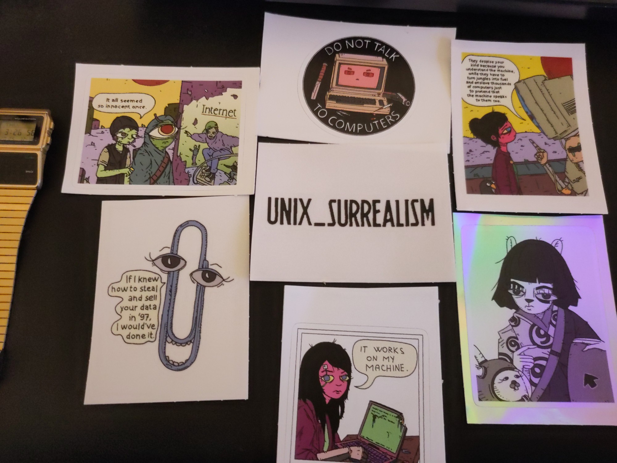 Our local Linux user group made a group order (Thanks Mark!) of unix surrealism stickers. Put one of them on an old system76 laptop and the other on a custom Crowview + raspberry pi velcroed to the laptop that my wife and I made from spare parts of other projects. The custom-top has a 9front sd card so its accurate.