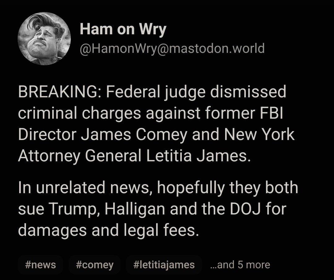 BREAKING: Federal judge dismissed criminal charges against former FBI Director James Comey and New York Attorney General Letitia James.