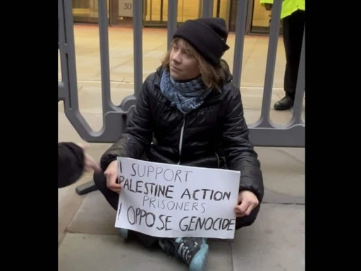 “Greta Thunberg was arrested under the Terrorism Act at the Prisoners for Palestine lock-on protest outside the offices of Aspen Insurance at Plantation Place, 30 Fenchurch Street, London, EC3M 3BD. She arrived after the protest began, with a sign reading “I support the Palestine Action prisoners. I oppose genocide”