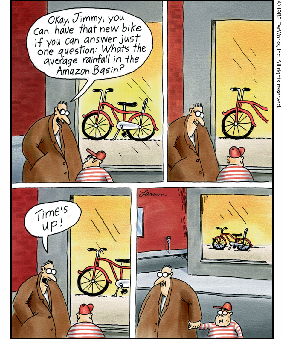 Okay, Jimmy, you can have that new bike if you can answer just one question: What's the average rainfall in the Amazon Basin? / Time's up!