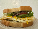 Ingredients: potato bread, mayo, sweet and spicy pickle slices, 2 eggs fried, lettuce, Roma tomato slices, red onion slice, alfalfa sprouts, and avocado slices.