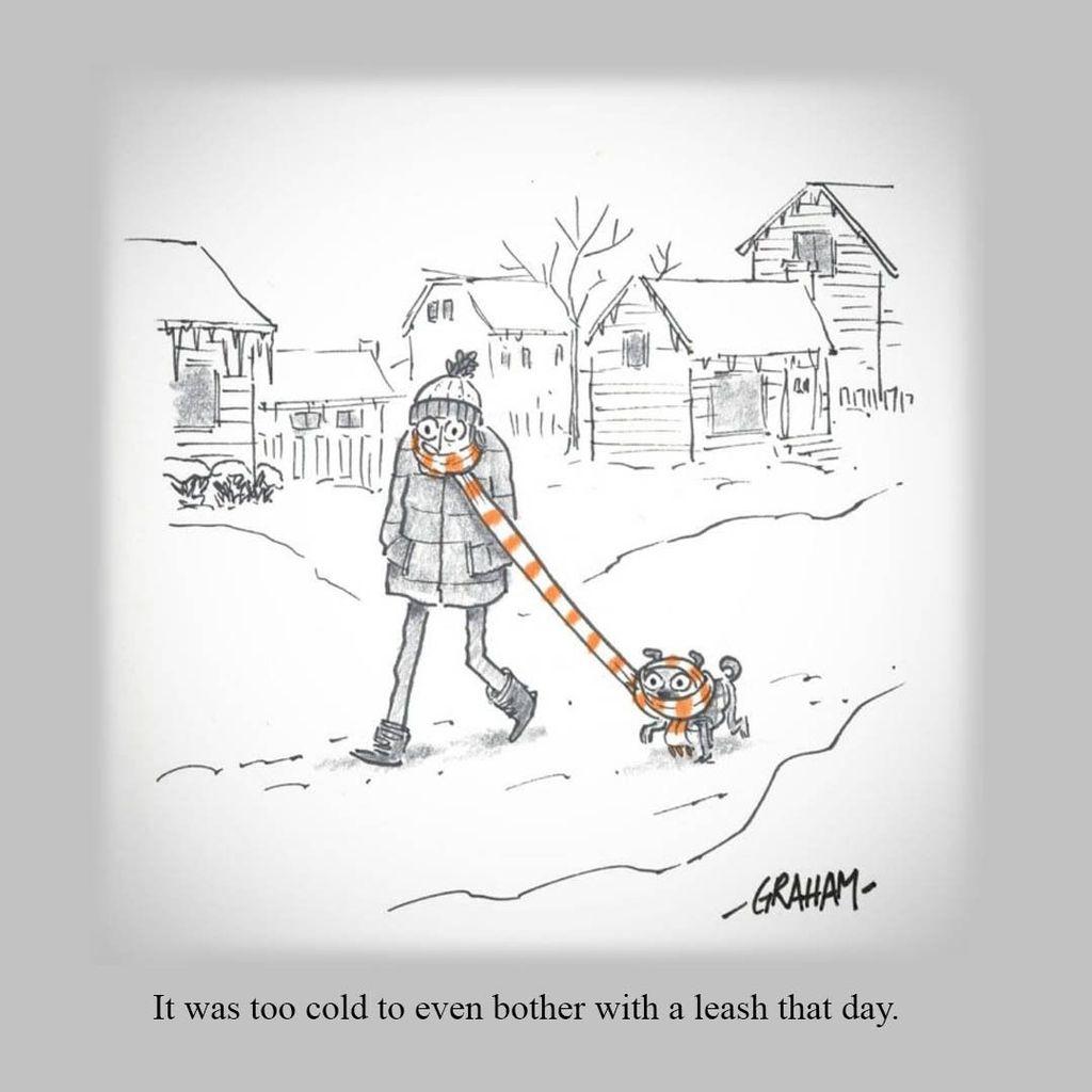 Alt Text: A cartoon illustration of a person and their pug walking outside in the winter, using a scarf wrapped around both their heads as a leash. Caption reads "It was too cold to even bother with a leash that day."