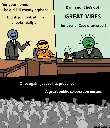 [a really cool looking character sits on a chair in prison gear, smiling smugly, sunglasses on their face][next to them, their lawyer pleads their case]Yes your honor,he did kill twenty orphansBut if you look at him,he looks really chill[at their desk, a judge looks really happy and slams their hammer]Damn right he's gotGREAT VIBESInnocent ! Case dismissed ![a crowd of numerous vaguely human shapes is celebrating]Once again, justice has prevailed.A great public celebration ensues.