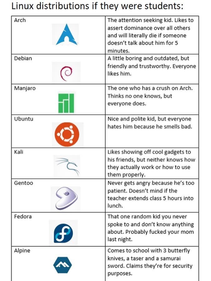 linuxmemes @lemmy.world The Picard Maneuver @piefed.world 12h ago Linux distributions if they were students