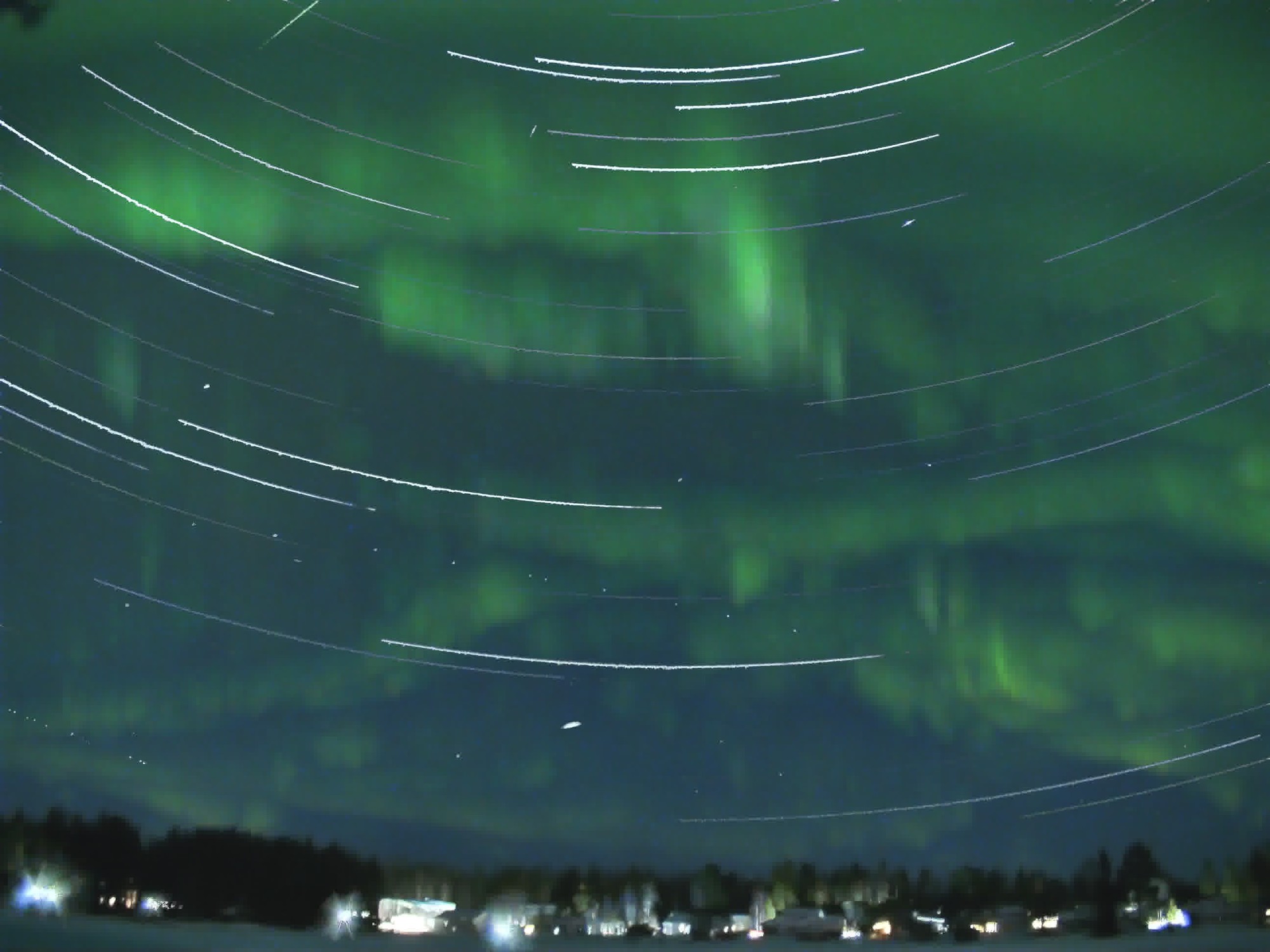 The sky was clear last night, and the auroral activity was supposed to be very low. So I left he camera rolling to create a star trail image.