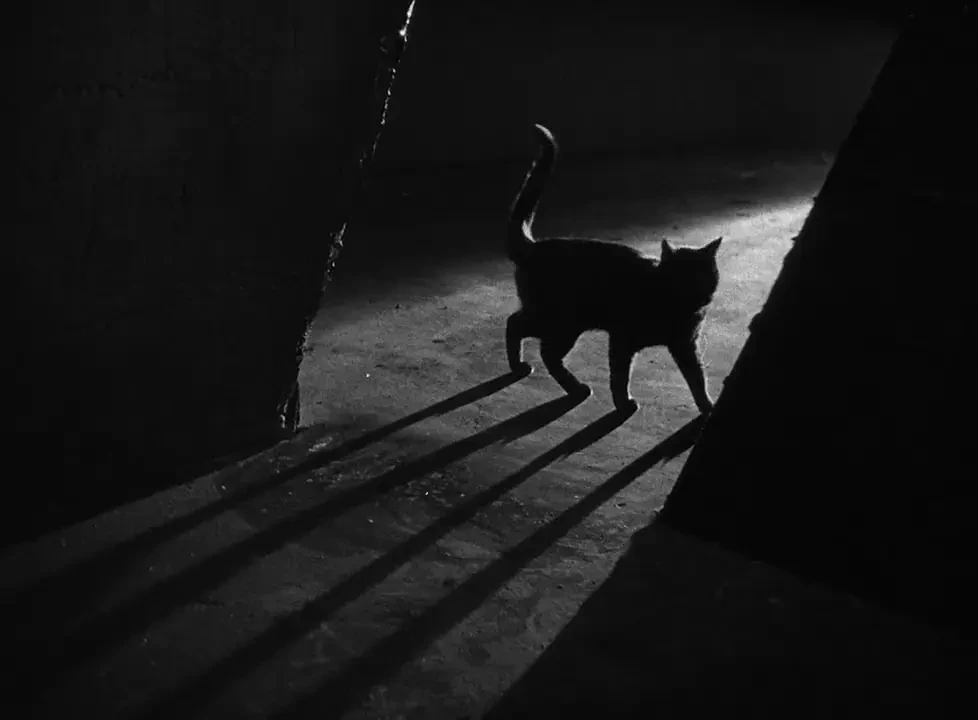 A black cat casts a long shadow as it walks across a gap between two columns.