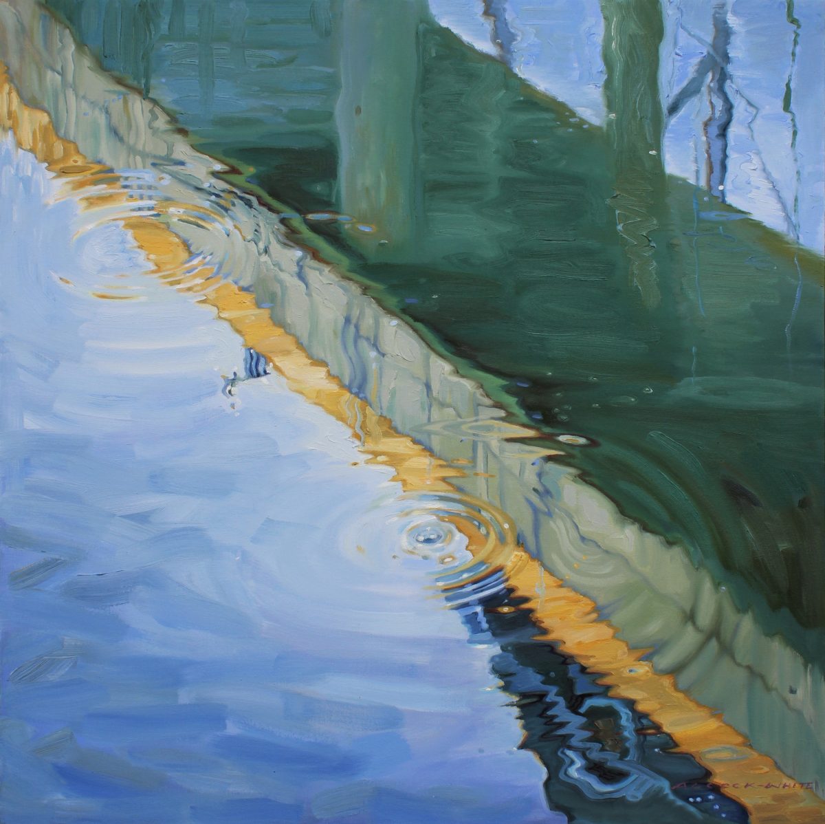 "The irregular ellipses of flattened colour, abstract patterns and highlighted surface reflections try to evoke a reverence for the mystery and importance of water, our natural world, its fragility and precariousness."