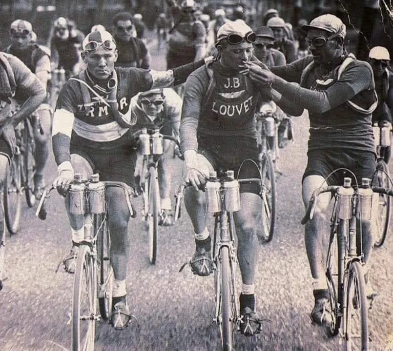 HistoryPhotos @piefed.social PugJesus @piefed.social 16h ago Cyclists in the Tour de France sharing a smoke, France, 1920