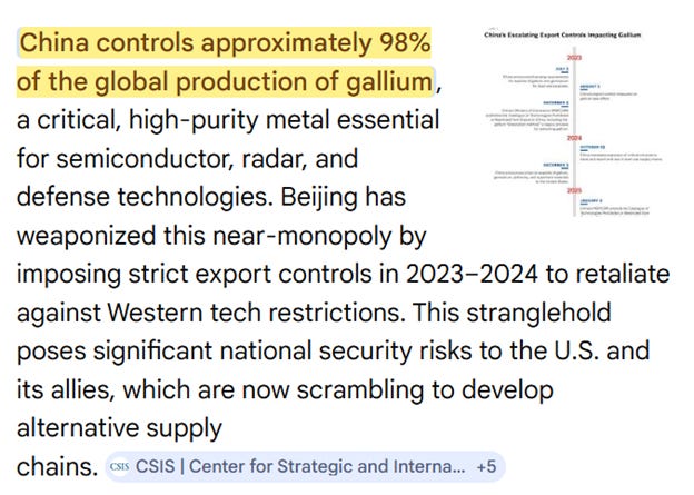 China has a monopoly on the production of gallium. 98% of the global production of gallium comes from here, while the United States is 100% dependent on imports. So these radar systems that are being blown up by Iranian drones and rockets, cannot be replaced until China relaxes those export bans to weapons makers.