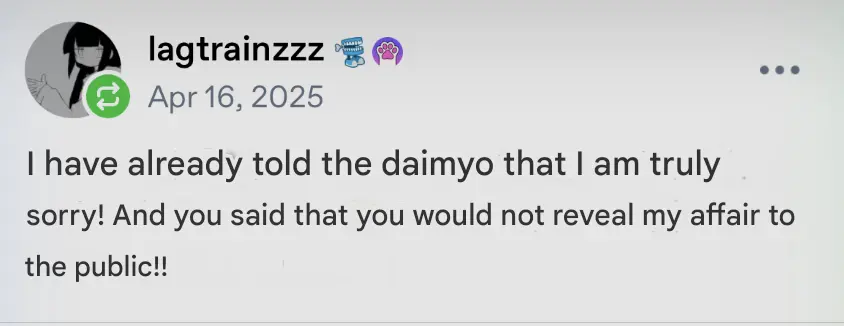 Per AI translation : " I have already told the daimyo that I am truly sorry ! And you said you would not reveal my affair to the public !! "